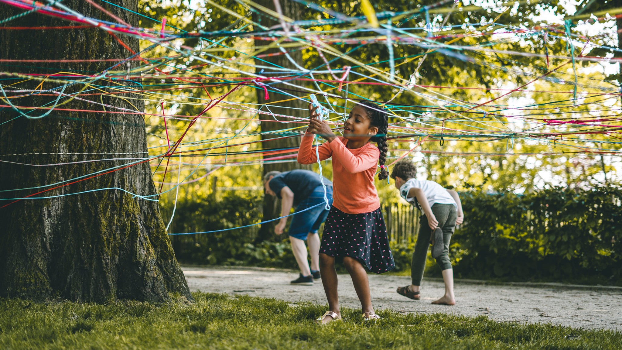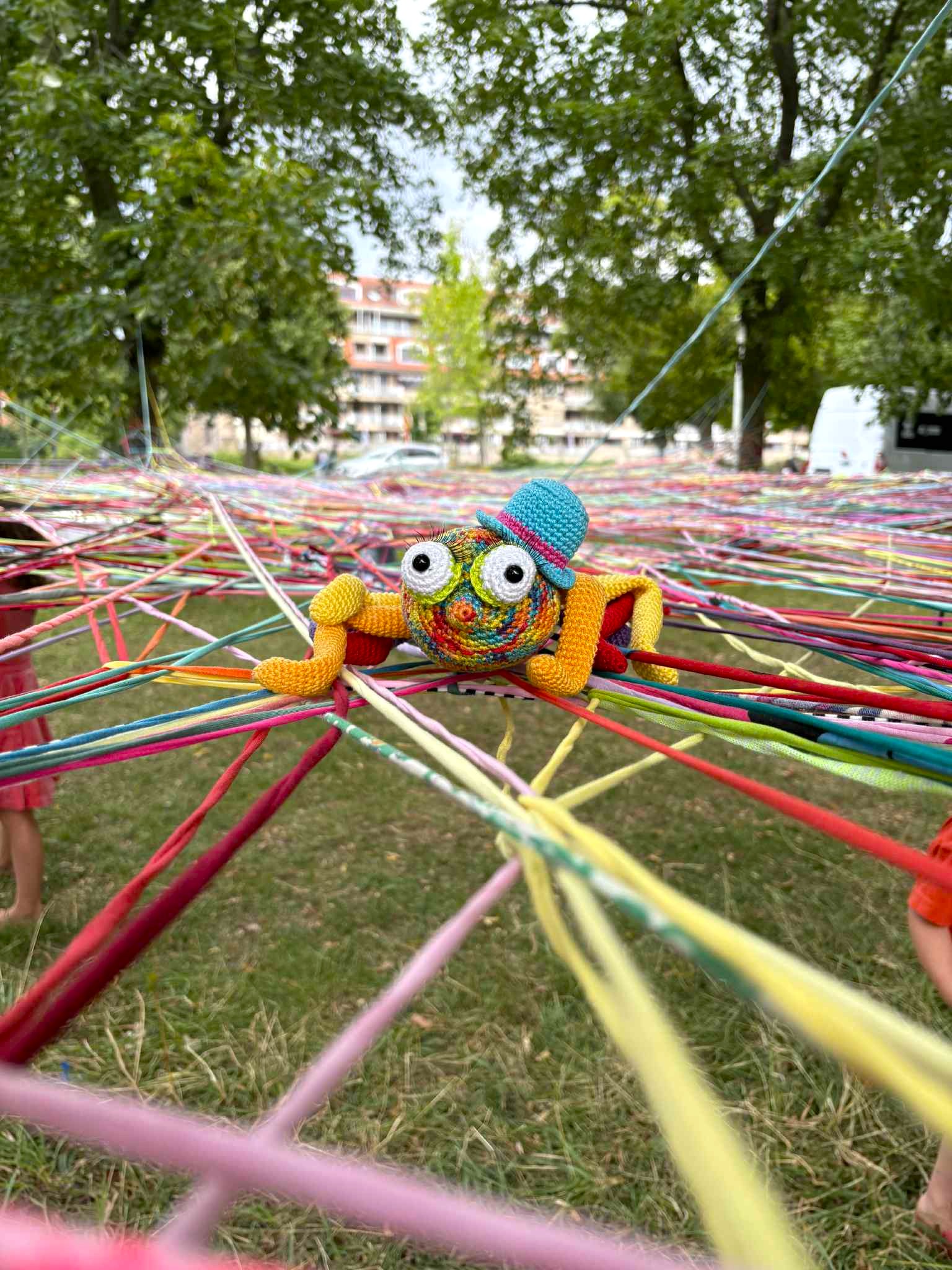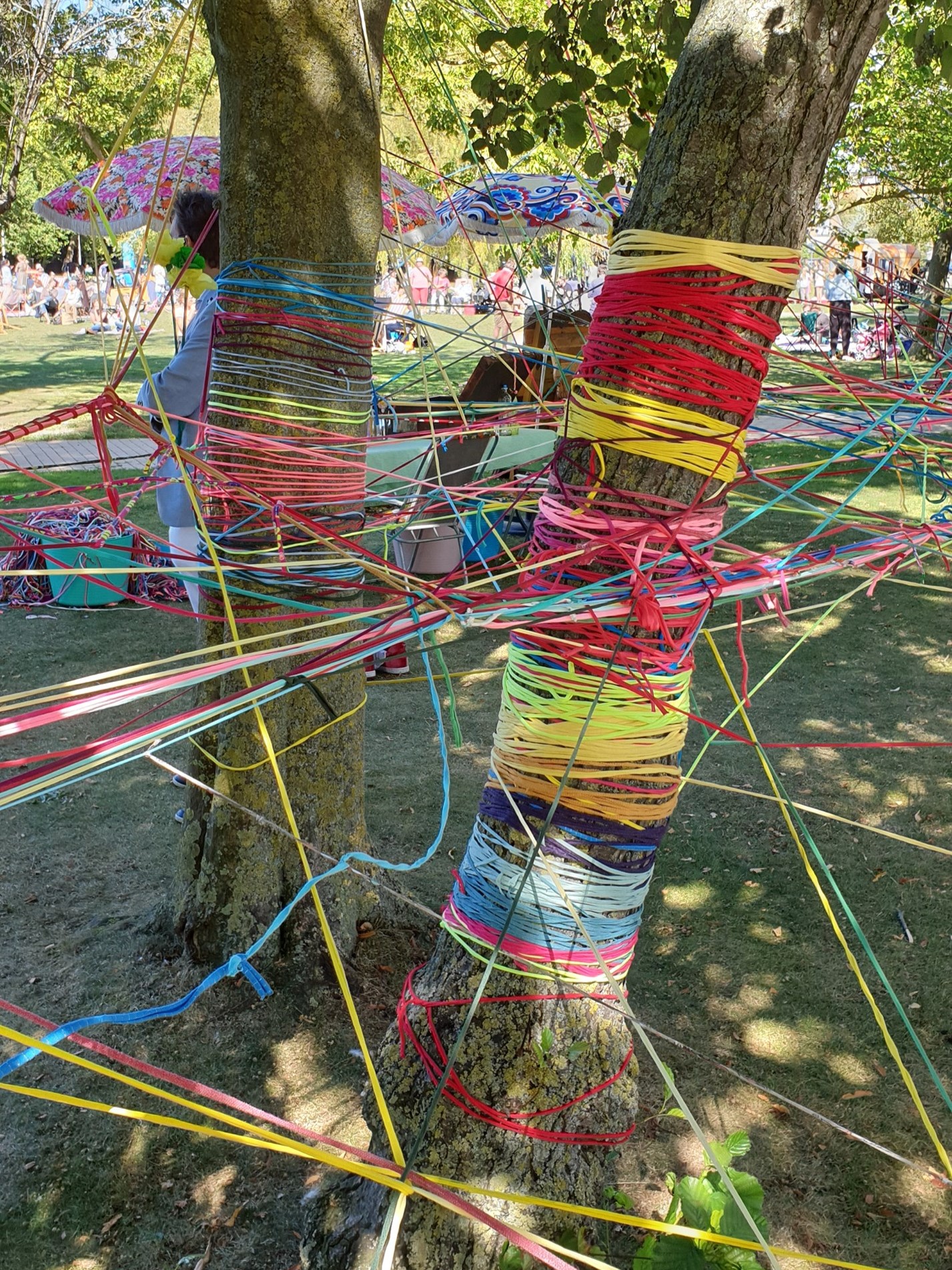 Met zijn allen maken we een enorm web van allerlei gekleurde, gerecyclede touwen.
