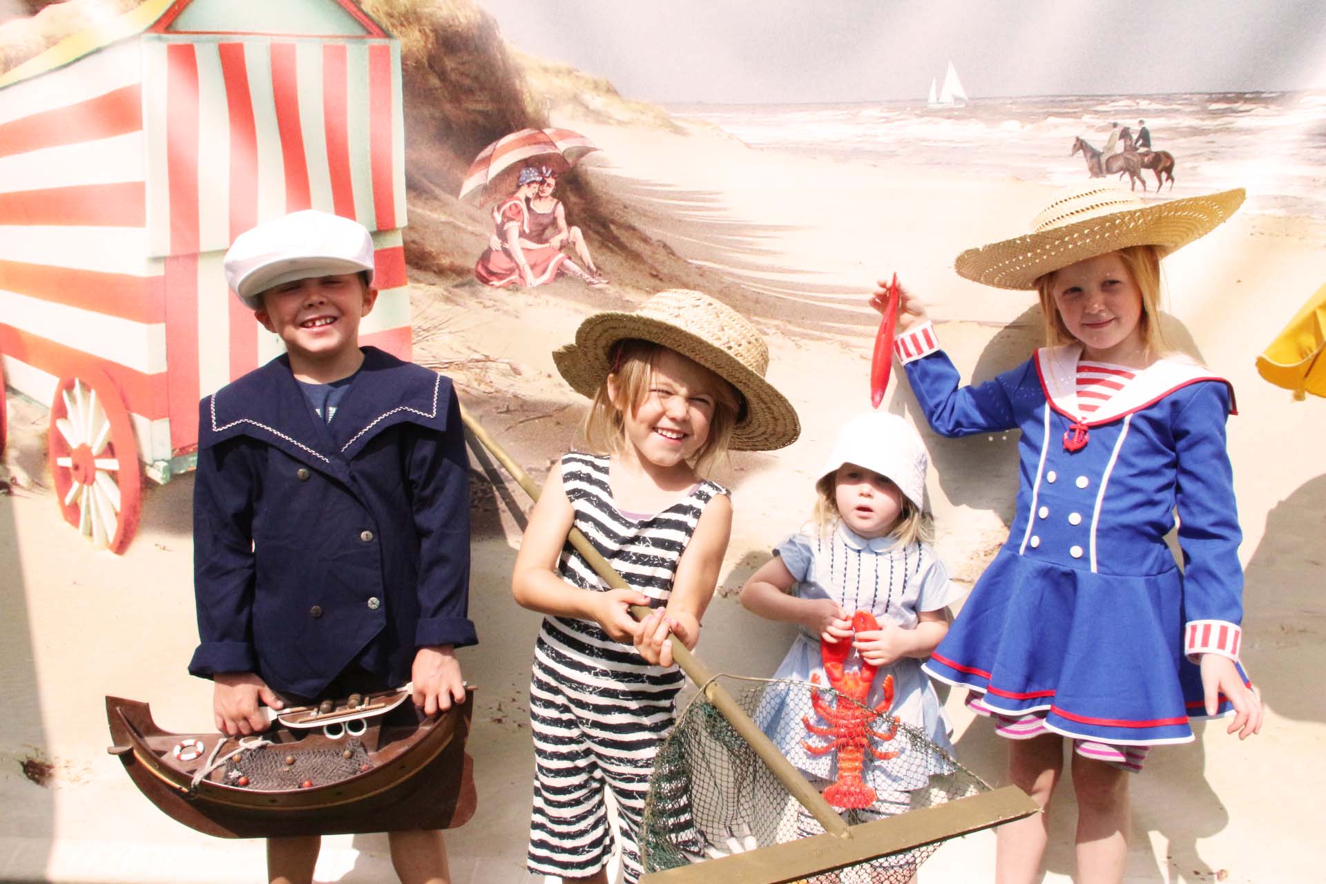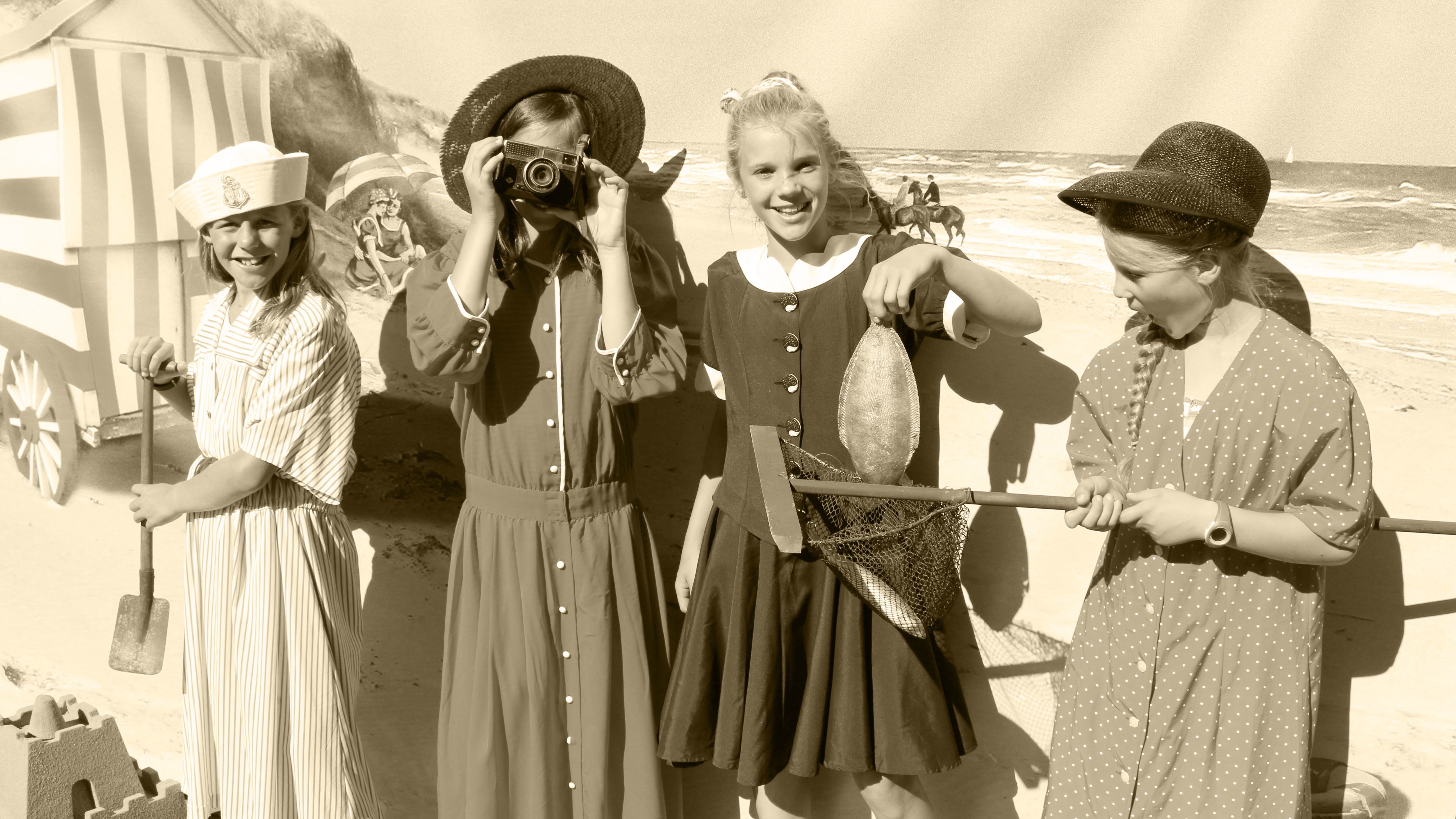 Zodra je met je voeten in het zand staat, stap je direct terug in de tijd. Een gezellige, zotte groepsfoto in een zonnige vintage strandstijl Sailor/French Beachstijl Terug naar de tijden van lange badpakken, badmutsen en uitklapbare strandstoelen. Streepjesmode, klapstoelen, sailor, schepnetjes, emmertjes etc. Thuis afdrukken maar... en dan heb je je eigen ansichtkaart!