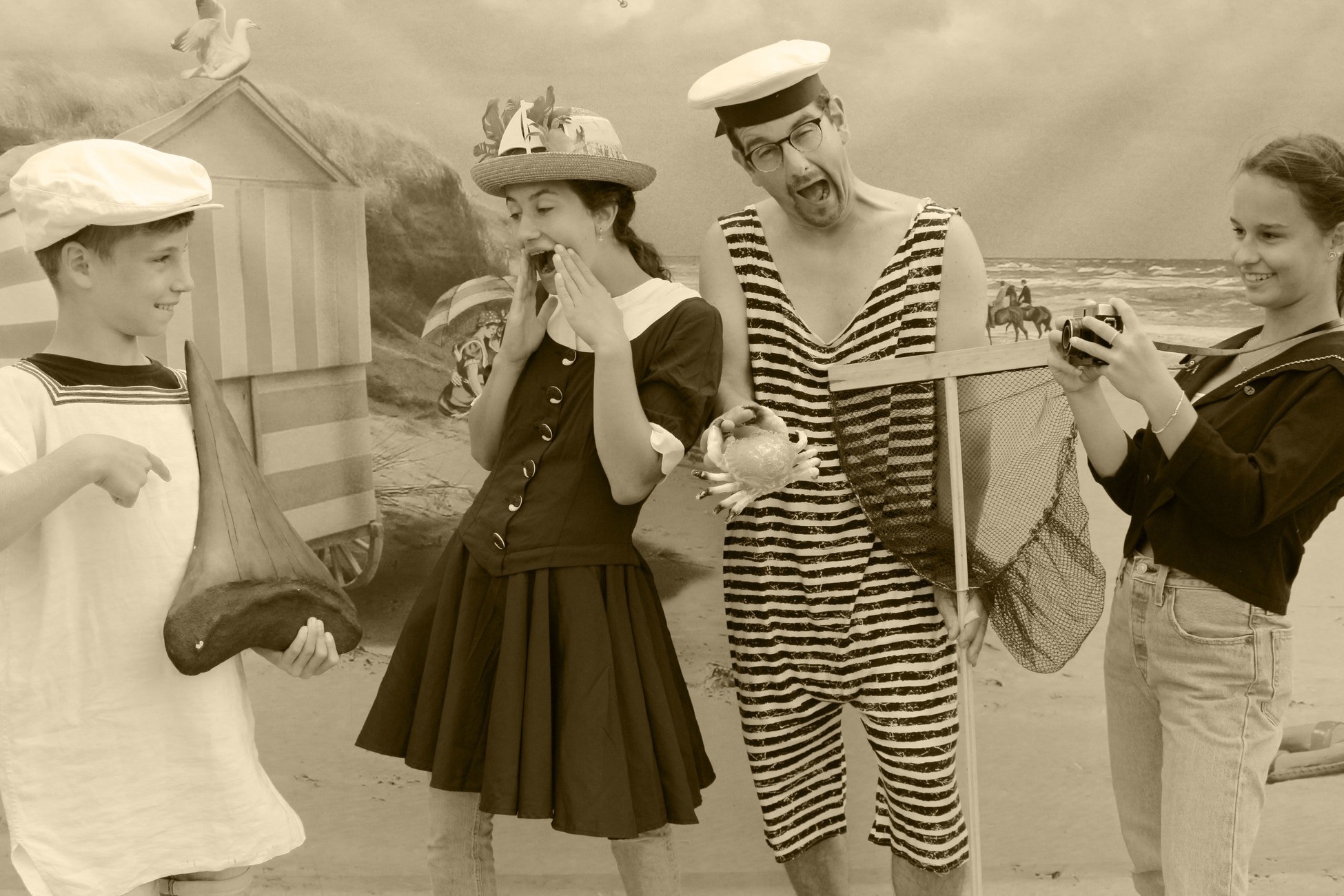 Afhankelijk van je lengte, krijg je een bepaald kostuum of attributen. Trek deze over je kleren aan of wikkel de handdoek om je heen. Kijk even naar wat inspirerende, oude foto's, luister naar de instructies en neem je passende pose aan! De foto's zijn terug te vinden op de website van uw evenement en op de website van Theater Lapstok en worden geleverd zowel in kleur als in sepia. Theater Lapstok verzorgt de achterwand, de attributen en indien mogelijk het zand en begeleidt uiteraard de activiteit voor een optimale foto.