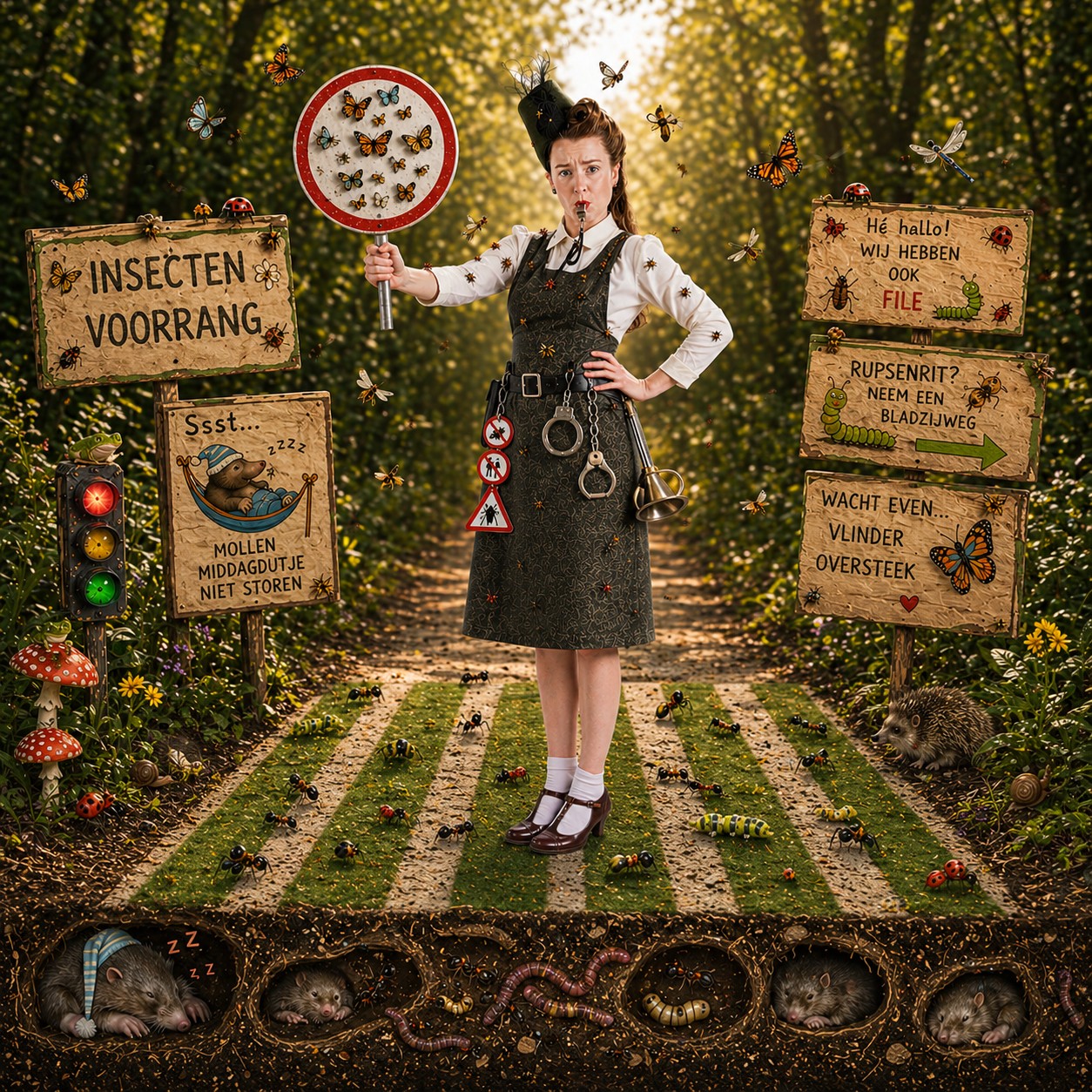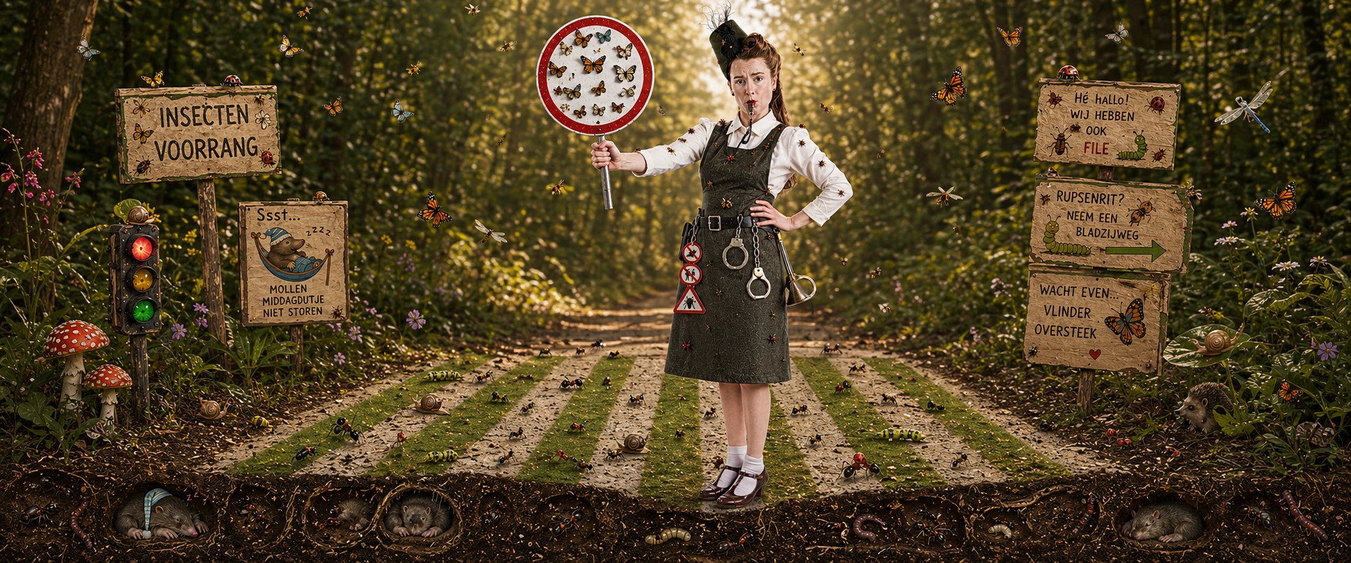 Insecten en overstekende huisdieren hebben vandaag voorrang! Wees dan ook niet verbaasd als Madame Brigadier ineens een zebrapad uitrolt, voetgangers sommeert te springen over de mierenstoet of kruipend verder te gaan om het keverpad niet te beschadigen. Wilt uw publiek zich net neerleggen in het gras, ook dan wordt deze zone flink geïnspecteerd zodat de dierenambulance niet ter plaatse hoeft te komen. Nog nooit was uw event zo groen en veilig!