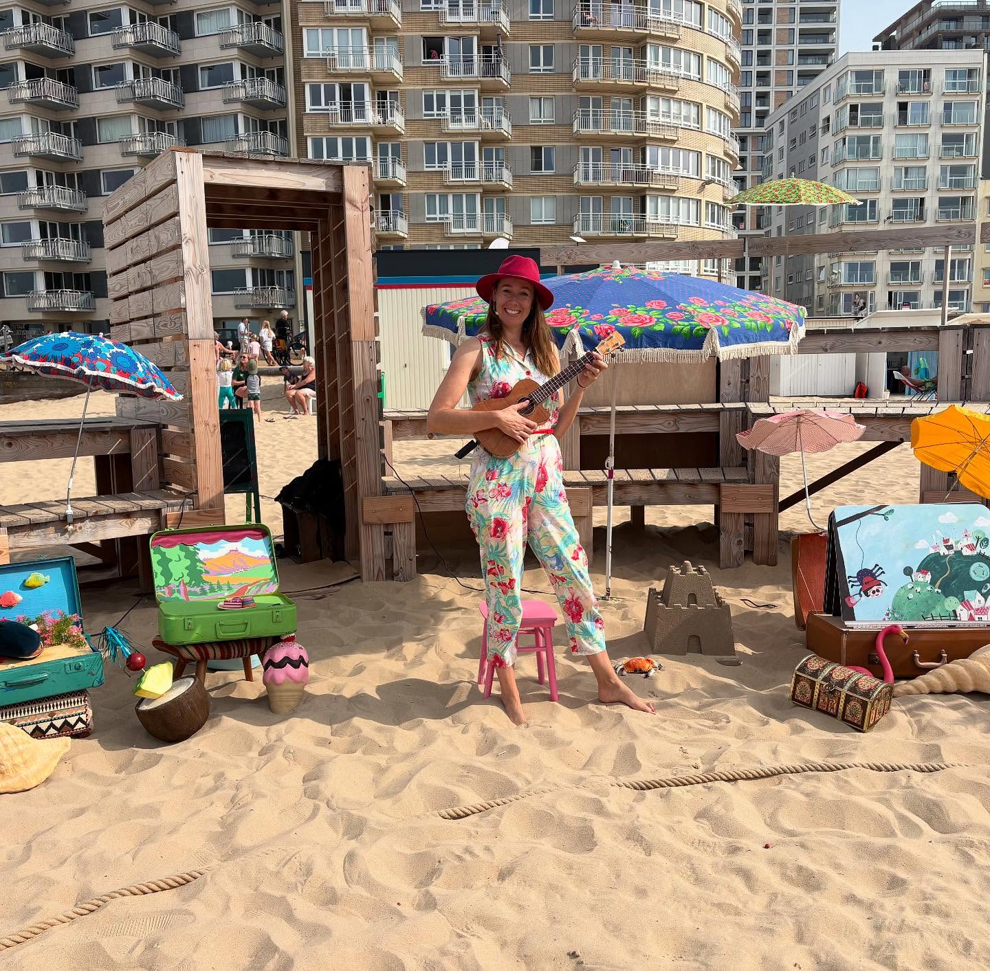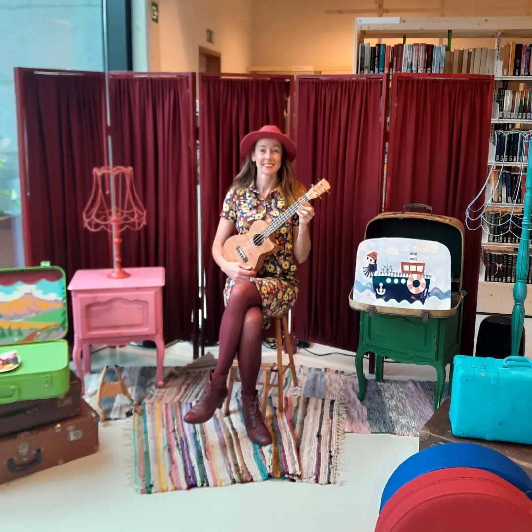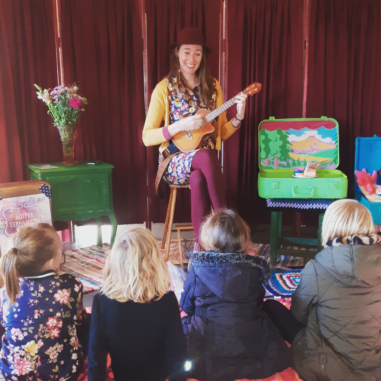 Met haar ukulele en oude vertelkoffers vertelt Lappie Lapstok zelfgeschreven korte en interactieve verhaaltjes en liedjes.