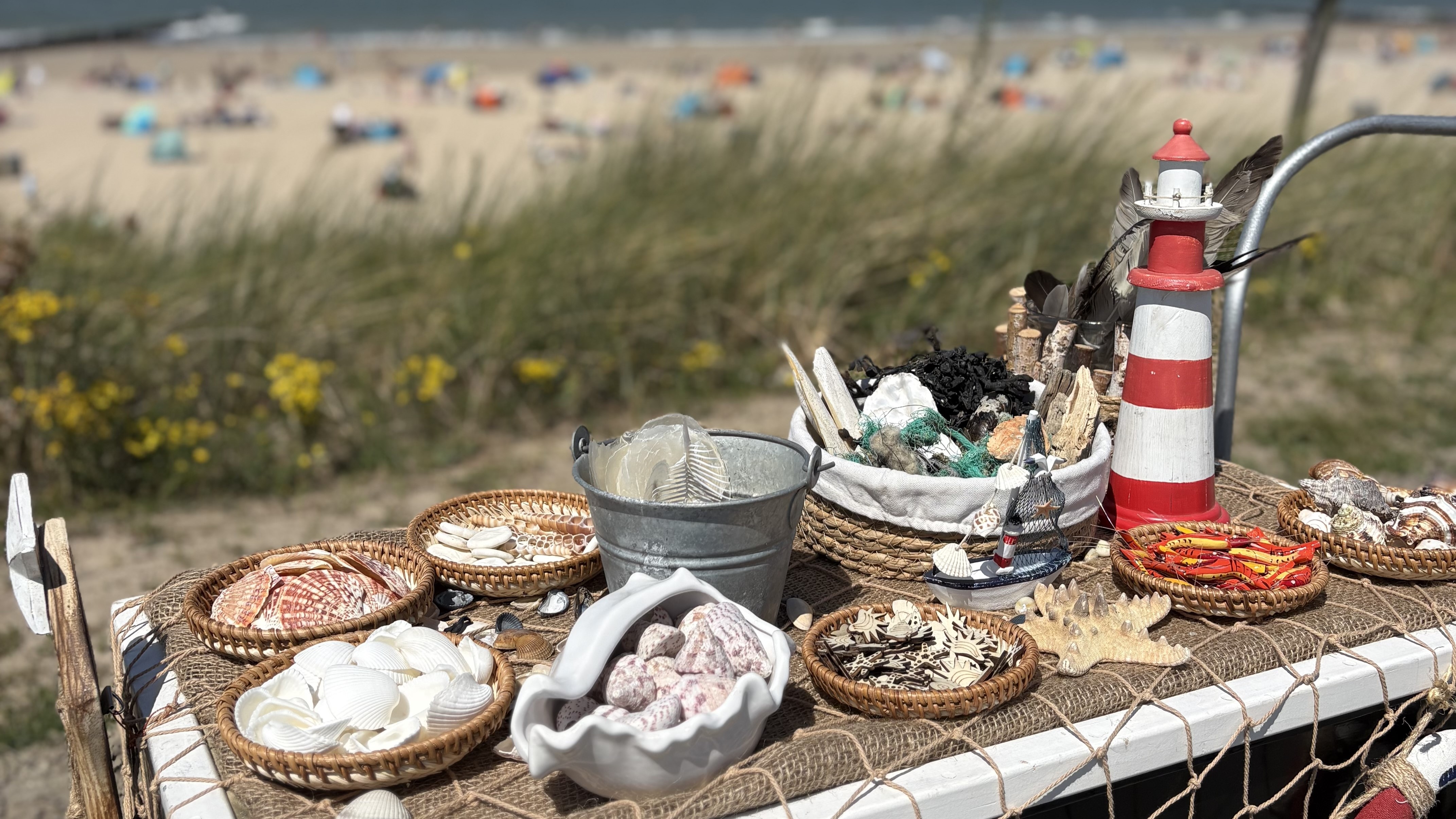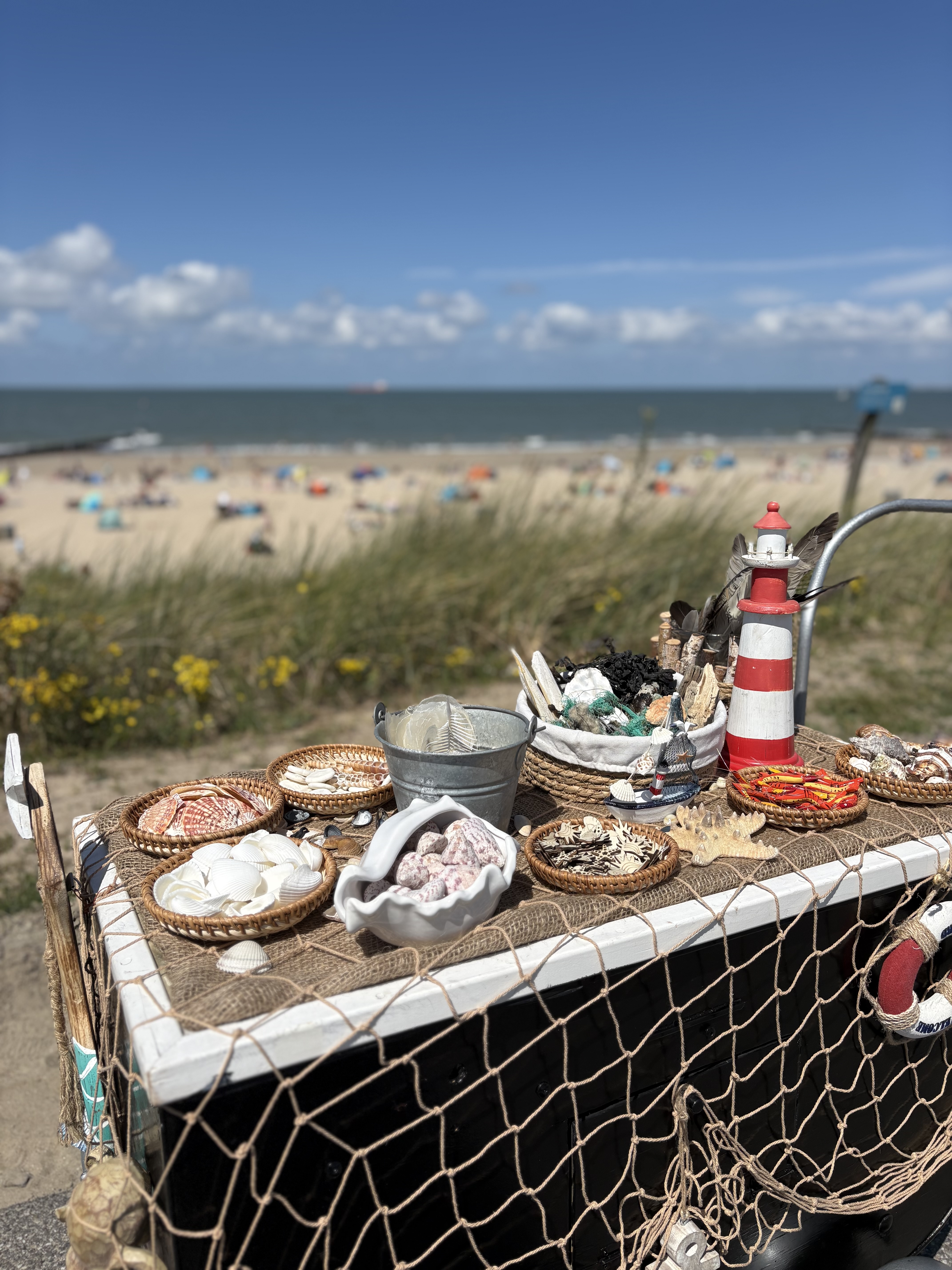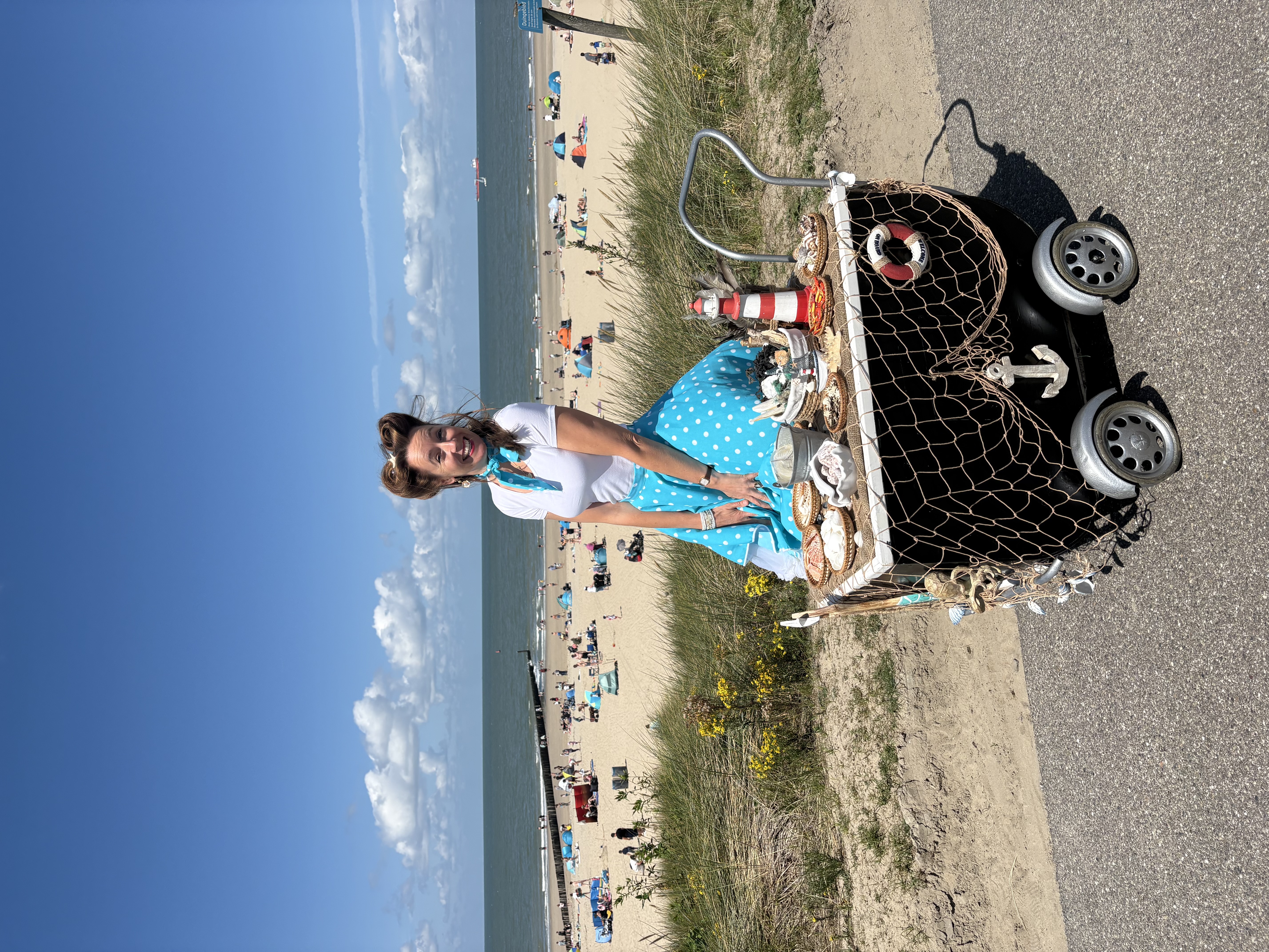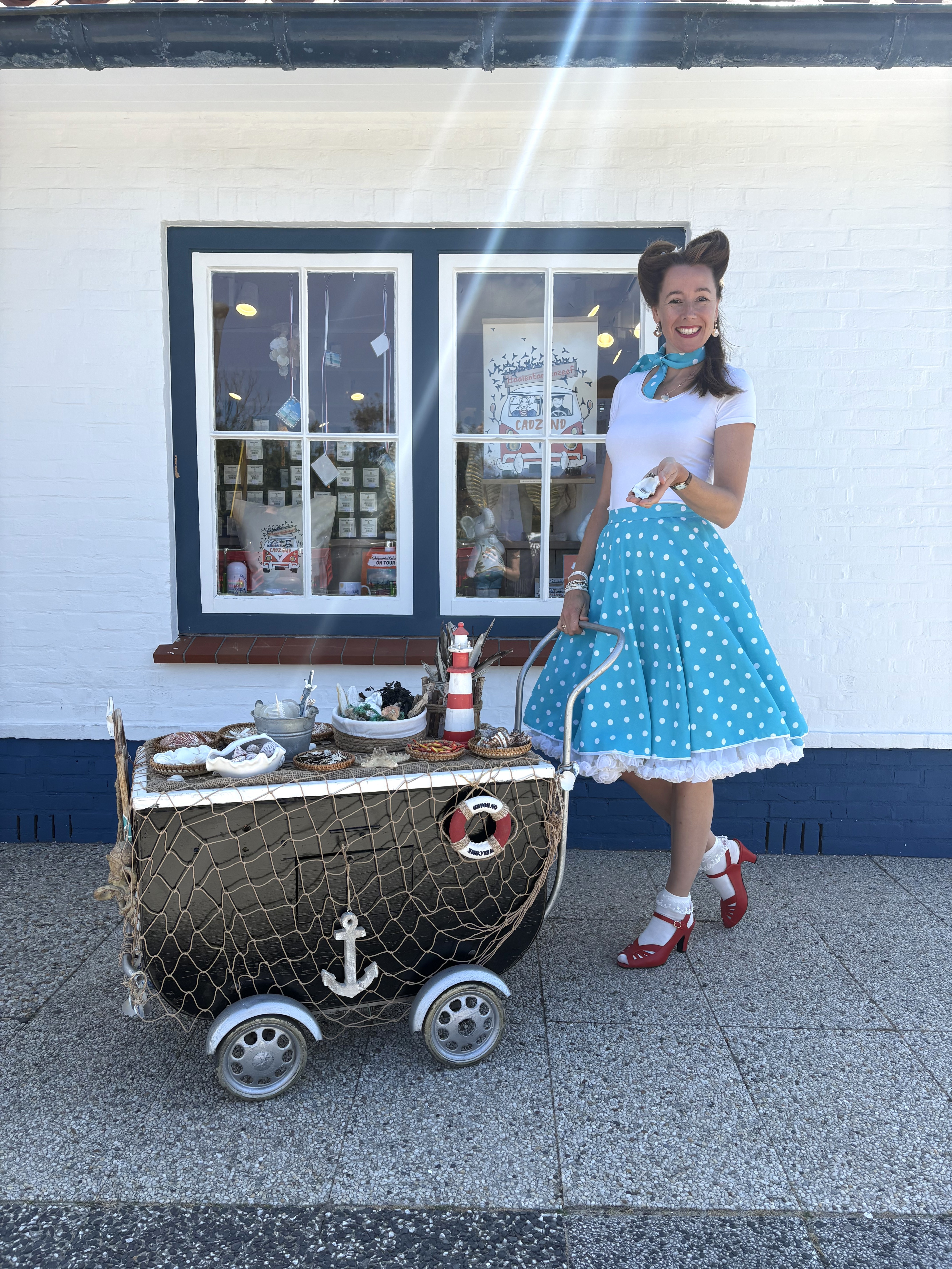 Een humoristische walking act voor jong en oud en te spelen op allerlei locaties (i.v.m. het karretje wel op de boulevard, niet op het strand zelf). Zowel binnen als buiten voorziet ze bezoekers van schelpen en strandjuttersvondsten.